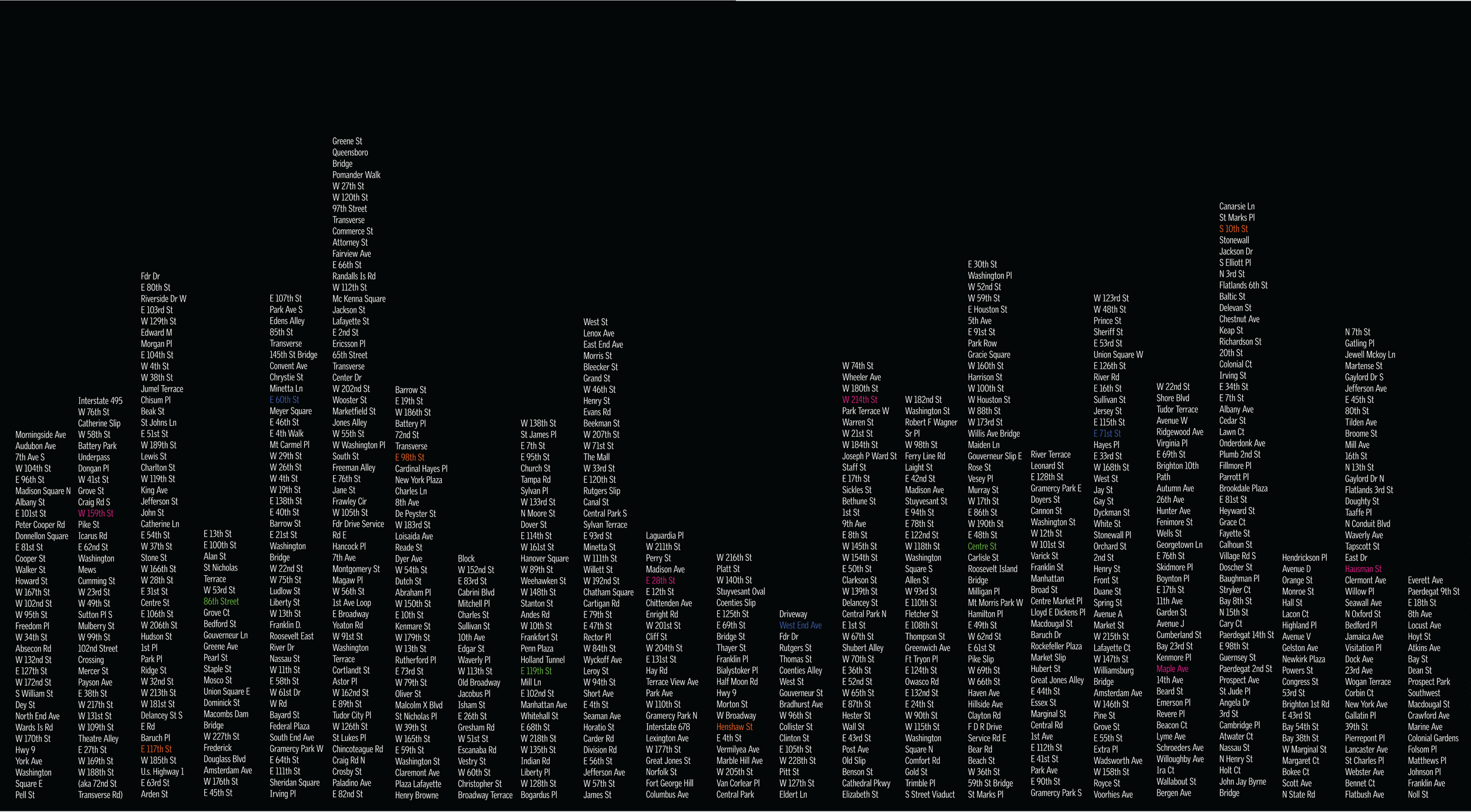 I designed an exhibition, booklet, and ad campaign centered on the work of Frere-Jones. The visual identity system was developed to function seamlessly across print, spatial, and digital environments. Drawing on the designer’s connection to NYC, I used his typeface Interstate to vertically stack street names to evoke the form of a cityscape. The color palette was derived from subway lines to provide another reference to the city. The booklet layout mirrored the structure of city blocks—compact, dense, and gridded—capturing the rhythm and order of the urban environment. The poster and social media tiles further expanded upon the visual identity, ensuring continuity across every touchpoint.